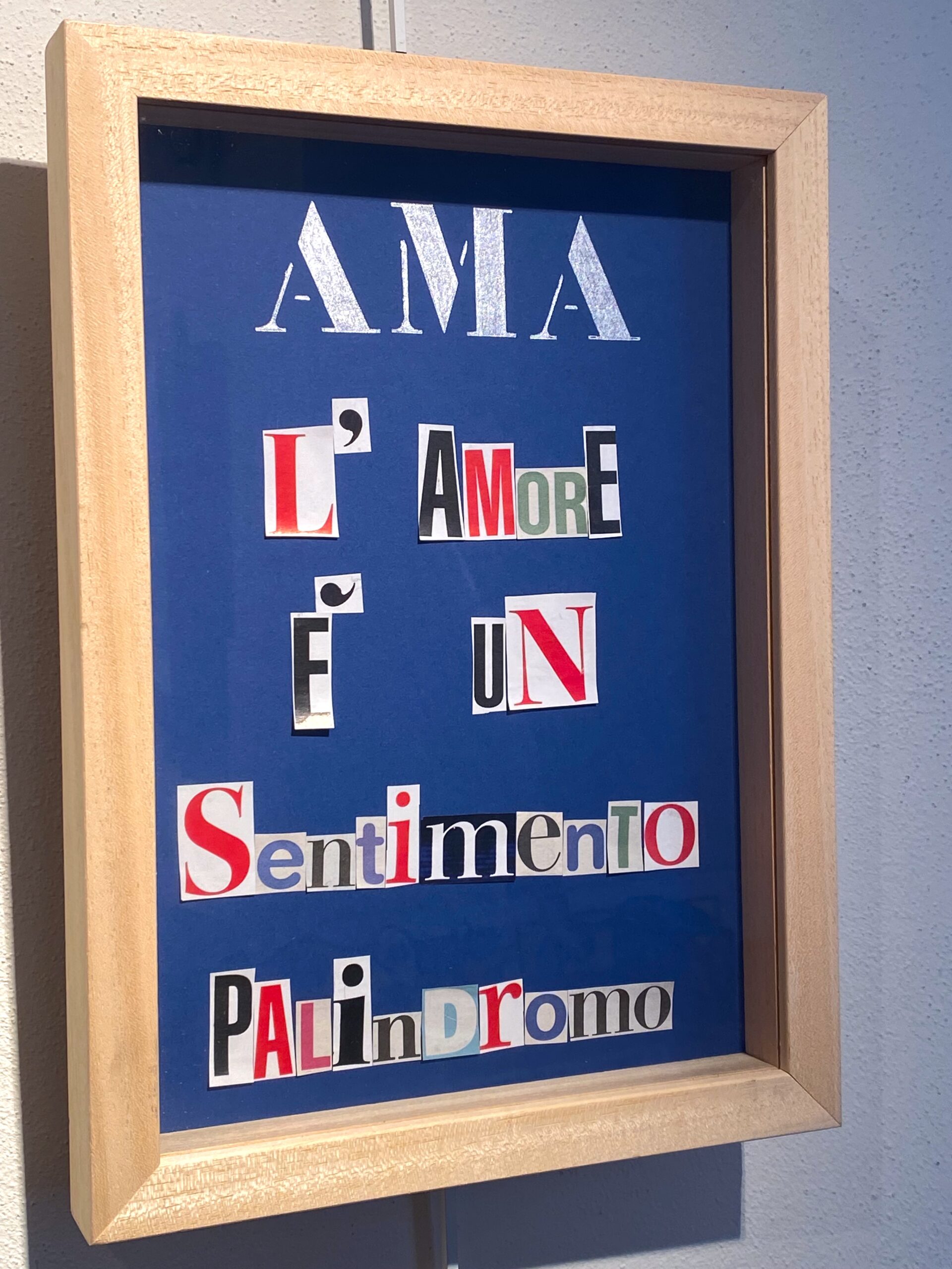Opera concettuale dove poesia, filosofia e letteratura si incontrano in un solo concetto di Amore : la parola palindroma “AMA” richiama e interpreta metaforicamente il sentimento Amore che ha bisogno di reciprocità.