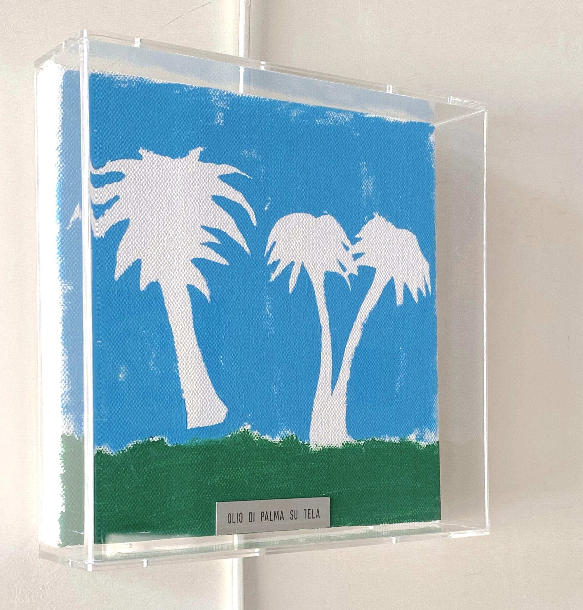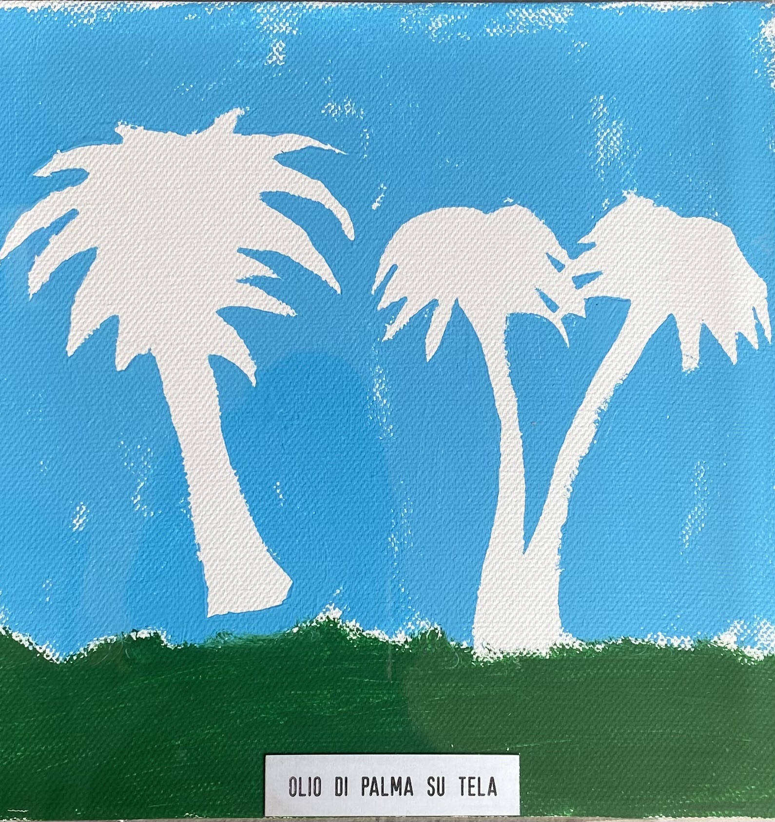 Deliziosa Icona d’arte ironica dedicata a Mario Schifano: le palme tanto amate dal grande artista in un nonsense riferito ad un dipinto ad olio tanto ricercato dal collezionismo ma… di palma!