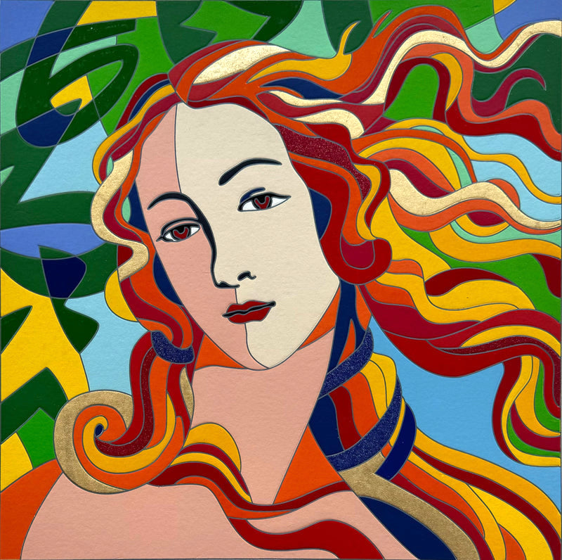 tecnica: serigrafia realizzata interamente a mano con interventi in carborundum, collage, floccaggi, foglia oro e passaggio calcografico a secco, su cartoncino pregiato